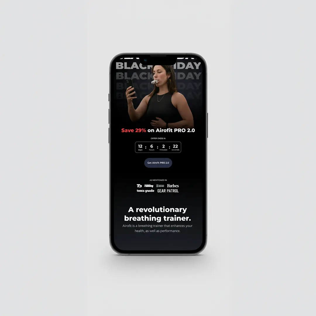 This landing page is supposed to communicate the biggest sale of the year. In this case, one could save 29% on one of their breathing training devices. Traffic to this page came from Meta ads, mostly static visuals that were quite straightforward, e.g., "Save 29% on Airofit breathing training device." There were three crucial things to be communicated on this page: urgency for the offer, what the device does, and, of course, a call-to-action to purchase.