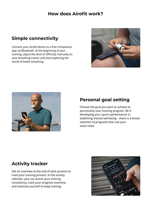I was responsible for the UX/UI design and the visual content, in close collaboration with the Web Coordinator and Digital Marketing Specialist. The sections on this page were agreed upon after some brainstorming sessions with the entire marketing team. Aligned with the three main communication points, we agreed on having: (1) a countdown in the hero section, (2) a brief explanation of what our breathing trainer does (since many people were still not very familiar with what respiratory training is), and (3) straightforward and visible "buy now" buttons. I used Figma for the UX/UI design and Adobe Photoshop for the visuals.